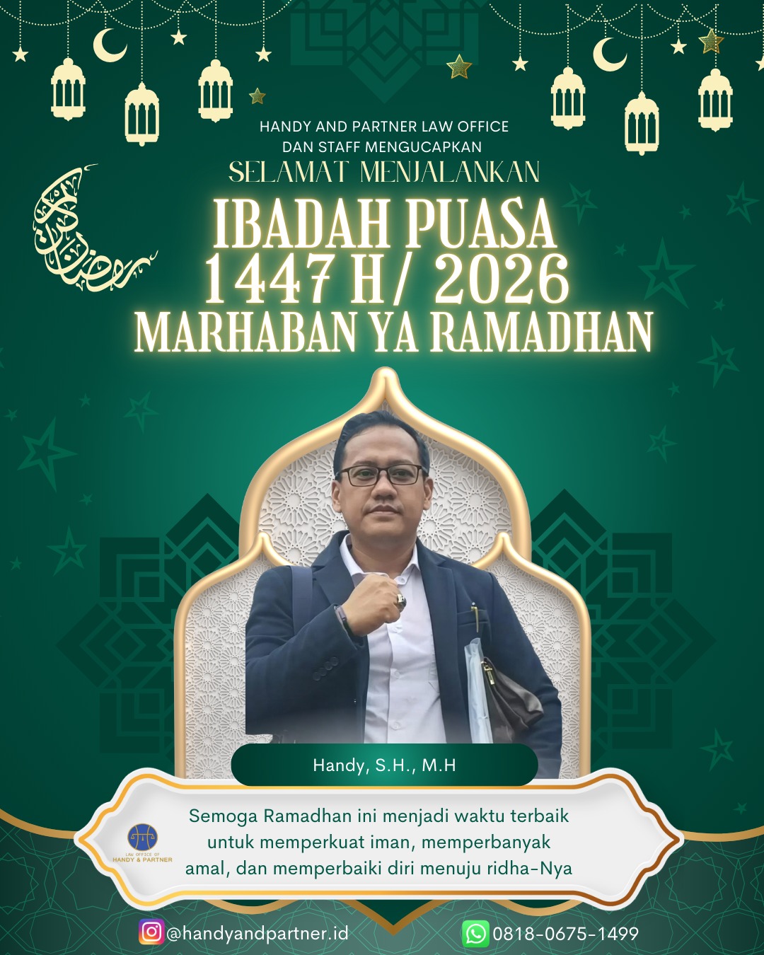 Memasuki bulan suci Ramadan 1447 Hijriah, CEO HukumWatch.com dan DelapanPlus.com, Handy S.H., M.H., menyampaikan ucapan Marhaban Ya Ramadhan kepada seluruh umat Muslim di Indonesia. Momentum suci ini menjadi pengingat pentingnya memperkuat nilai spiritual, solidaritas sosial, dan integritas dalam setiap langkah kehidupan.