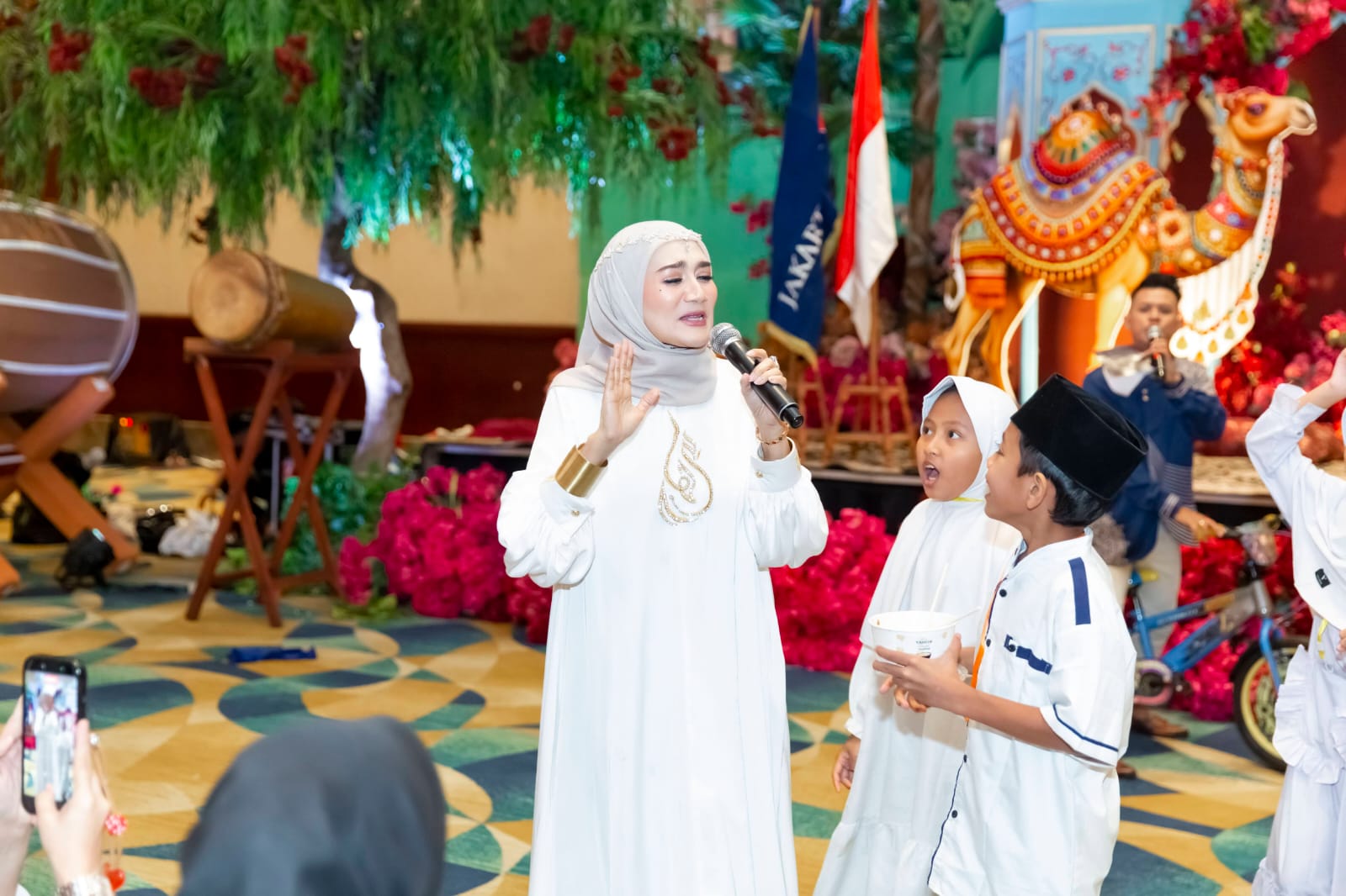 Suasana kebersamaan semakin meriah dengan kehadiran sejumlah selebritas Indonesia seperti Mario, Niniek Carlina, dan Diah Permata Sari yang turut menyapa serta berbagi kebahagiaan bersama anak-anak yatim.